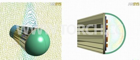 那么怎樣驗證熱解決方法是否有效呢?一種是通過實驗測量 溫度,但是一旦條件改變就要重新測量,效率比較低。因此需要使用CAE軟件進行仿真。 圖2 運用ANSYS解析軟件,在LED燈橫向擺放時,對LED燈周圍的熱和空氣的流動進行仿真。(?。?(??)是整個燈的溫度分布圖,紅色部分代表溫度高,藍色部分代表溫度低。(?#?(?ぃ┦塹樸胩ED封裝周邊(蓋子內部)的自然對流圖,紅色箭頭部分表示對流速度快,藍色部分表示對流速度慢。與實際情況相比,這個例子只是一個非常簡單的模型,但從某種程度上卻能驗證產品的溫度分布和空氣的自然對流。 從整個燈的溫度分布來看,雖說蓋子的溫度低,其他部位溫度高,但是某種程度上還是處于一個均等的溫度分布。這表面產生的熱量大部分都轉移到散熱器上,而且傳送路徑中沒有障礙。散熱器可以起到一個散熱的作用,但是如果散熱特性不好,整個燈的溫度就會上升,因此必須注意散熱器的形狀(安裝散熱片的大小、形狀、個數等)。